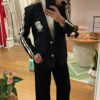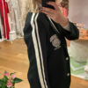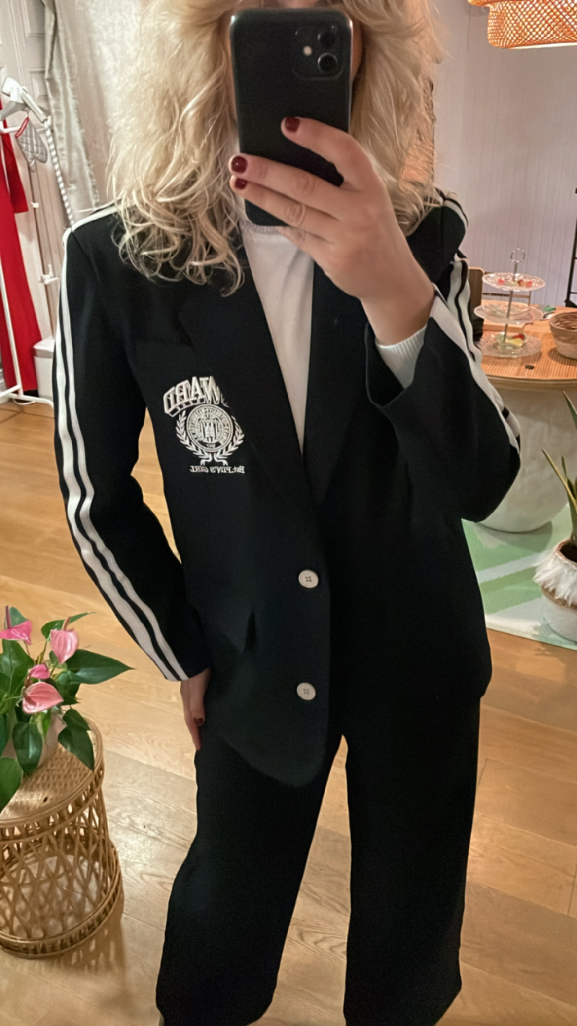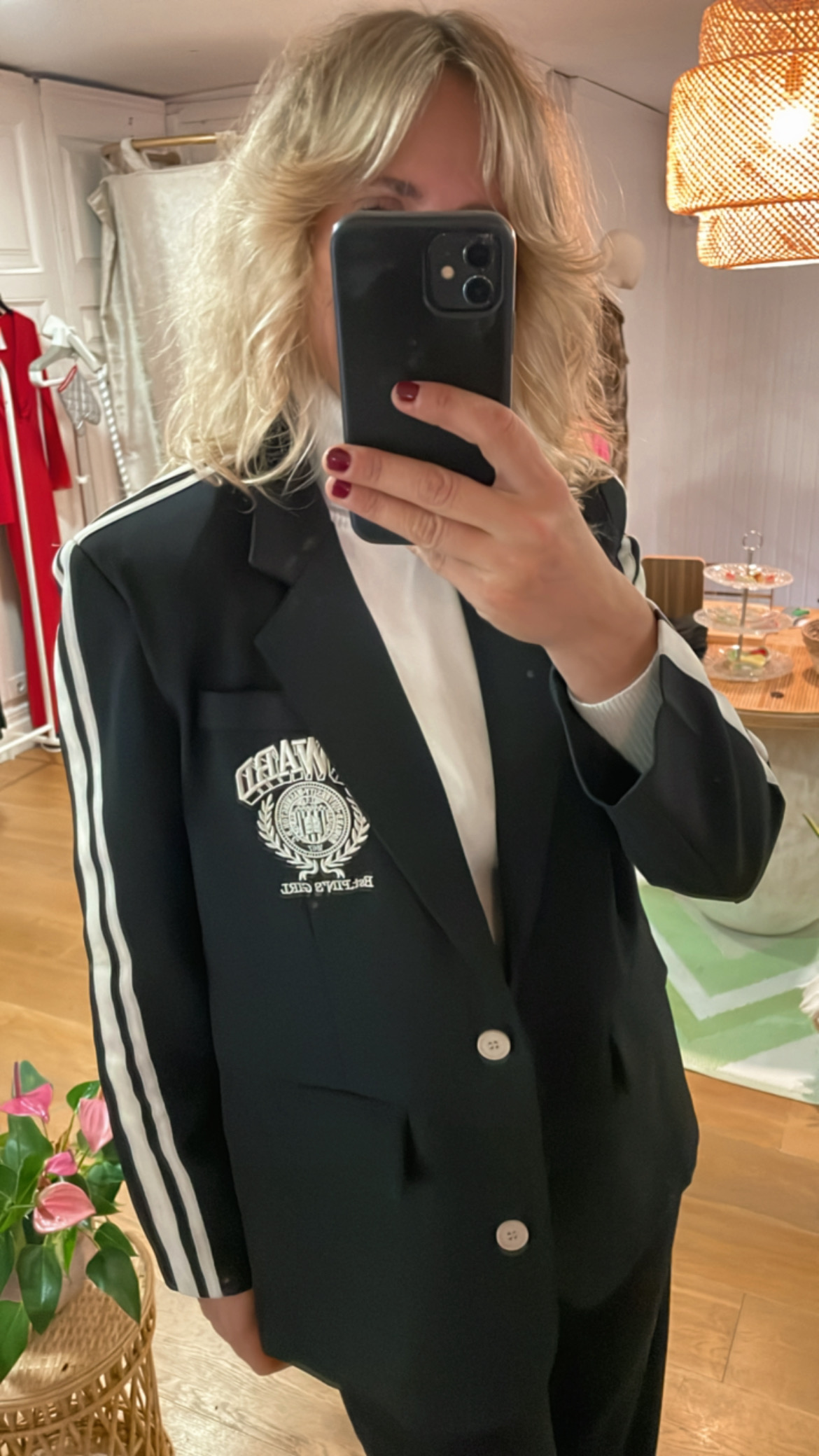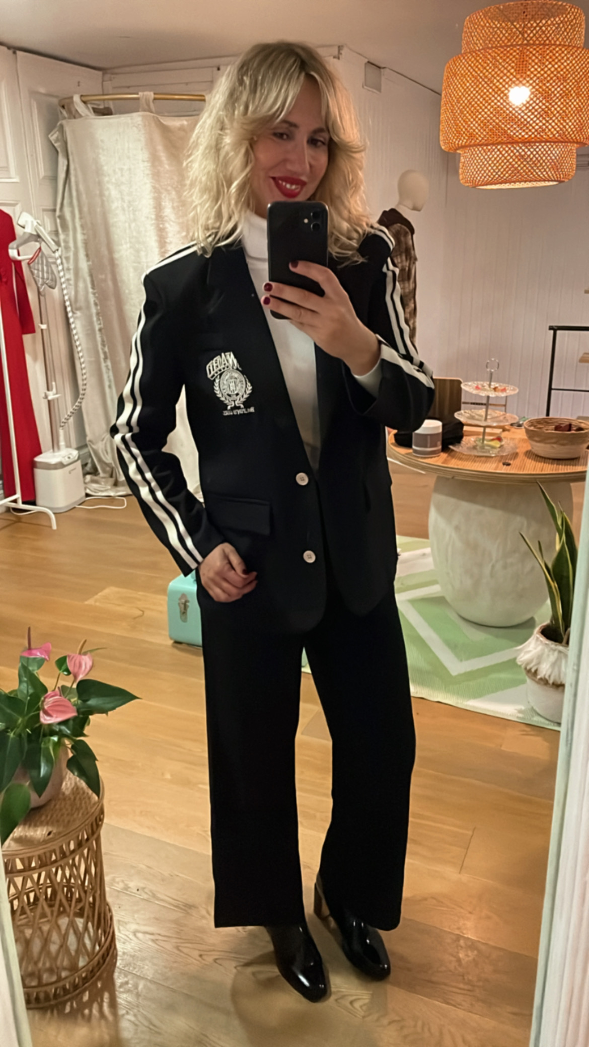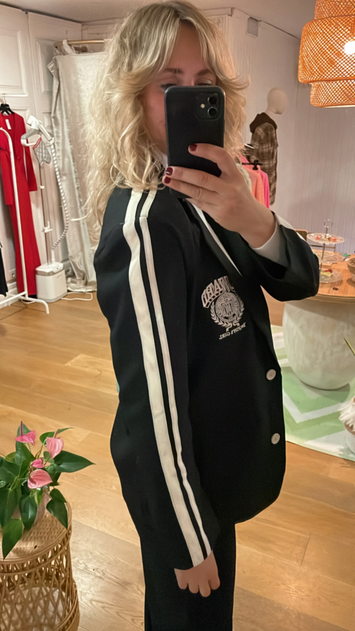 Esta blazer oversize combina el estilo clásico con un toque deportivo y universitario. Confeccionada en un tejido negro de alta calidad, presenta un corte holgado que aporta comodidad y una silueta moderna. A lo largo de los laterales, destacan tiras blancas que añaden contraste y un aire urbano.