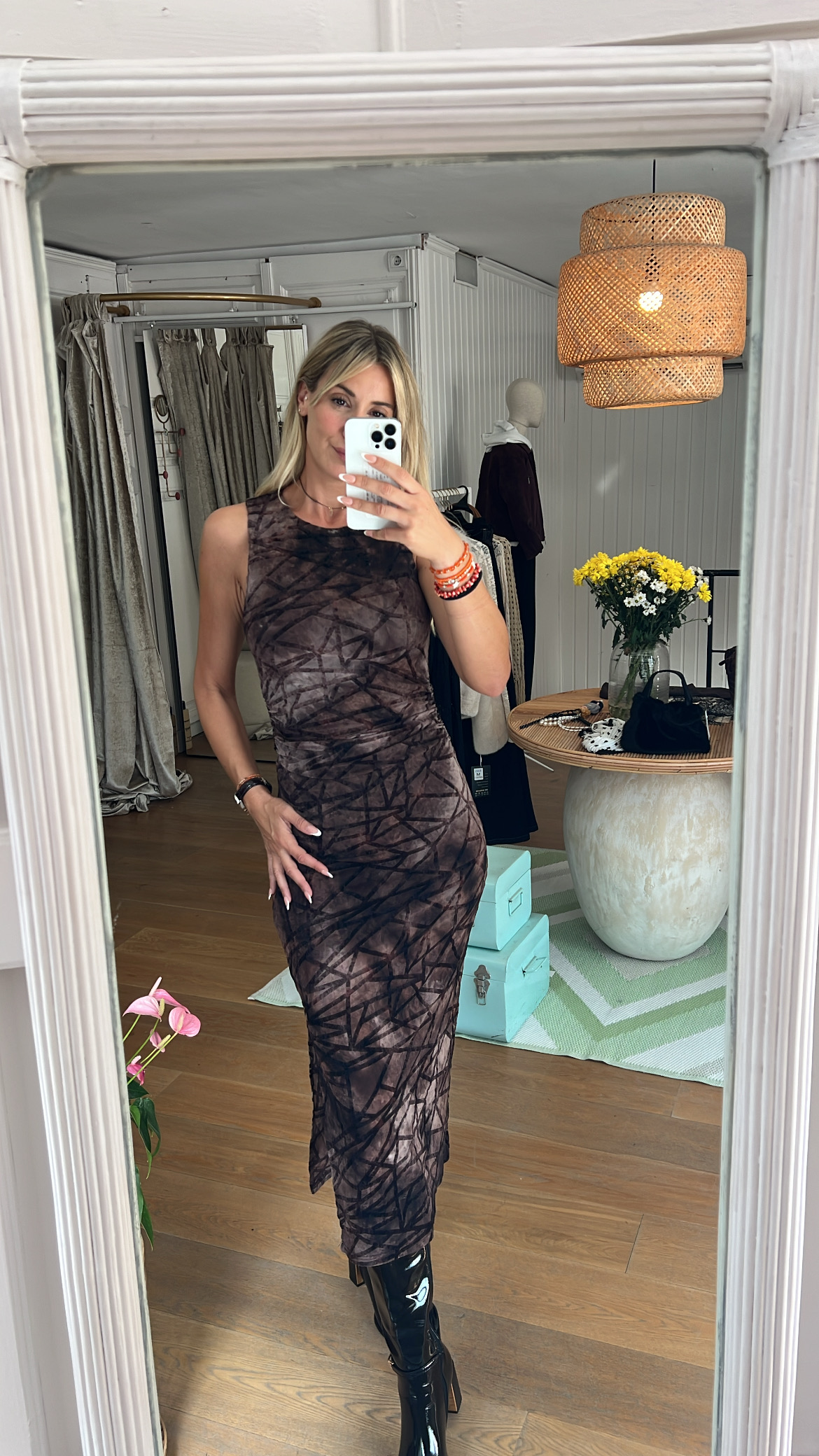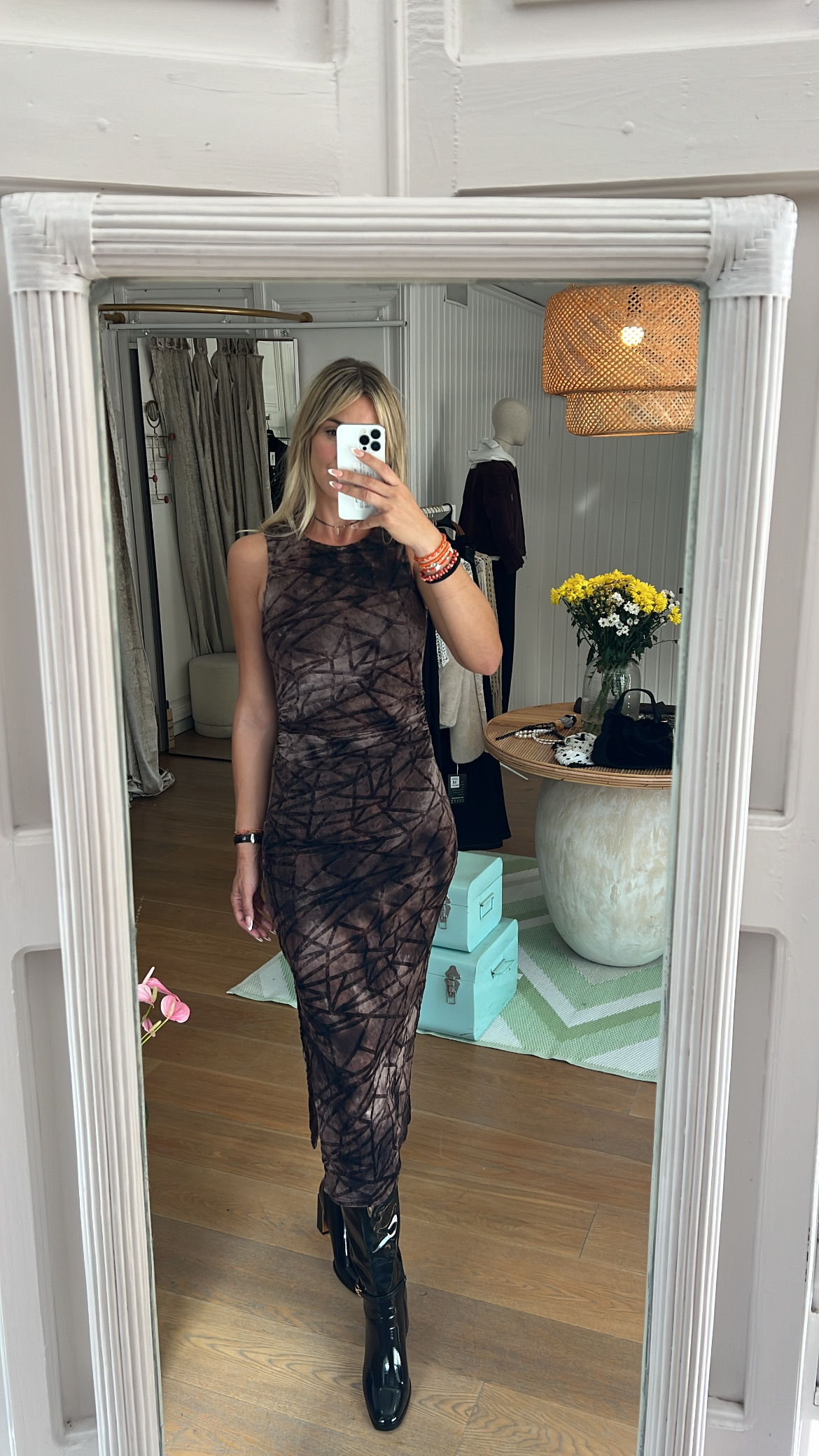 Vestido midi sin mangas en base marrón con estampado geométrico en negro. Su corte ajustado resalta la silueta mientras que la abertura lateral aporta un toque moderno y cómodo. El tejido elástico lo convierte en una prenda versátil y muy favorecedora, perfecta para looks de día con botines o de noche con tacones.