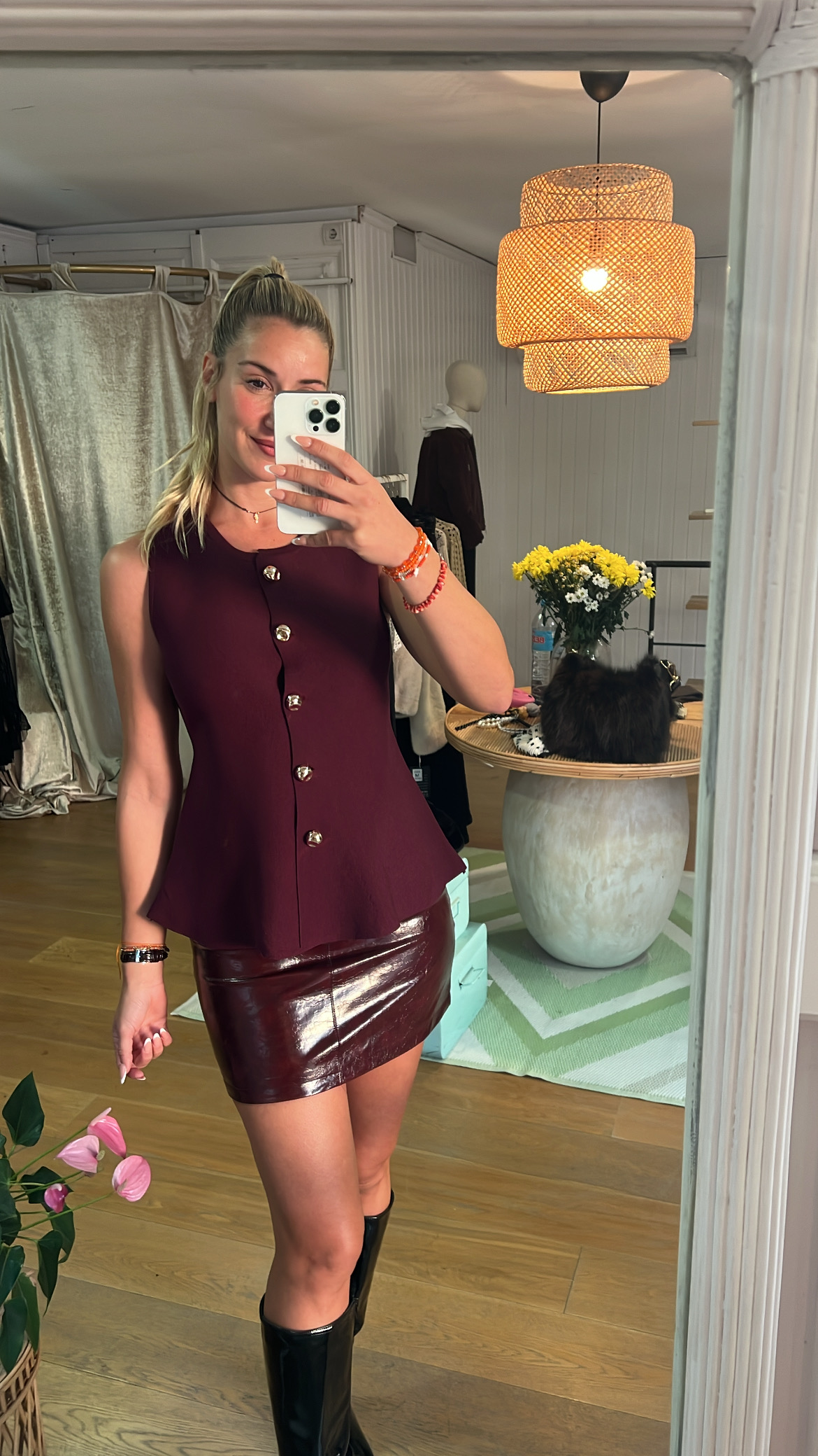Elegancia y estilo en una sola prenda ✨. Chaleco sin mangas en tono burdeos con corte entallado y vuelo sutil en el bajo que estiliza la figura. Los botones dorados en relieve aportan un aire sofisticado y chic, perfecto para elevar cualquier look. Llévalo con falda, pantalón o incluso sobre camisas para un outfit más trendy.