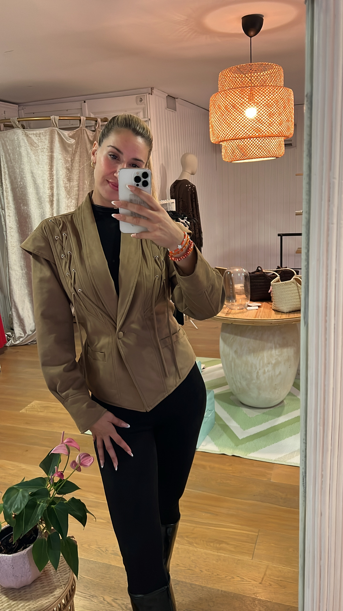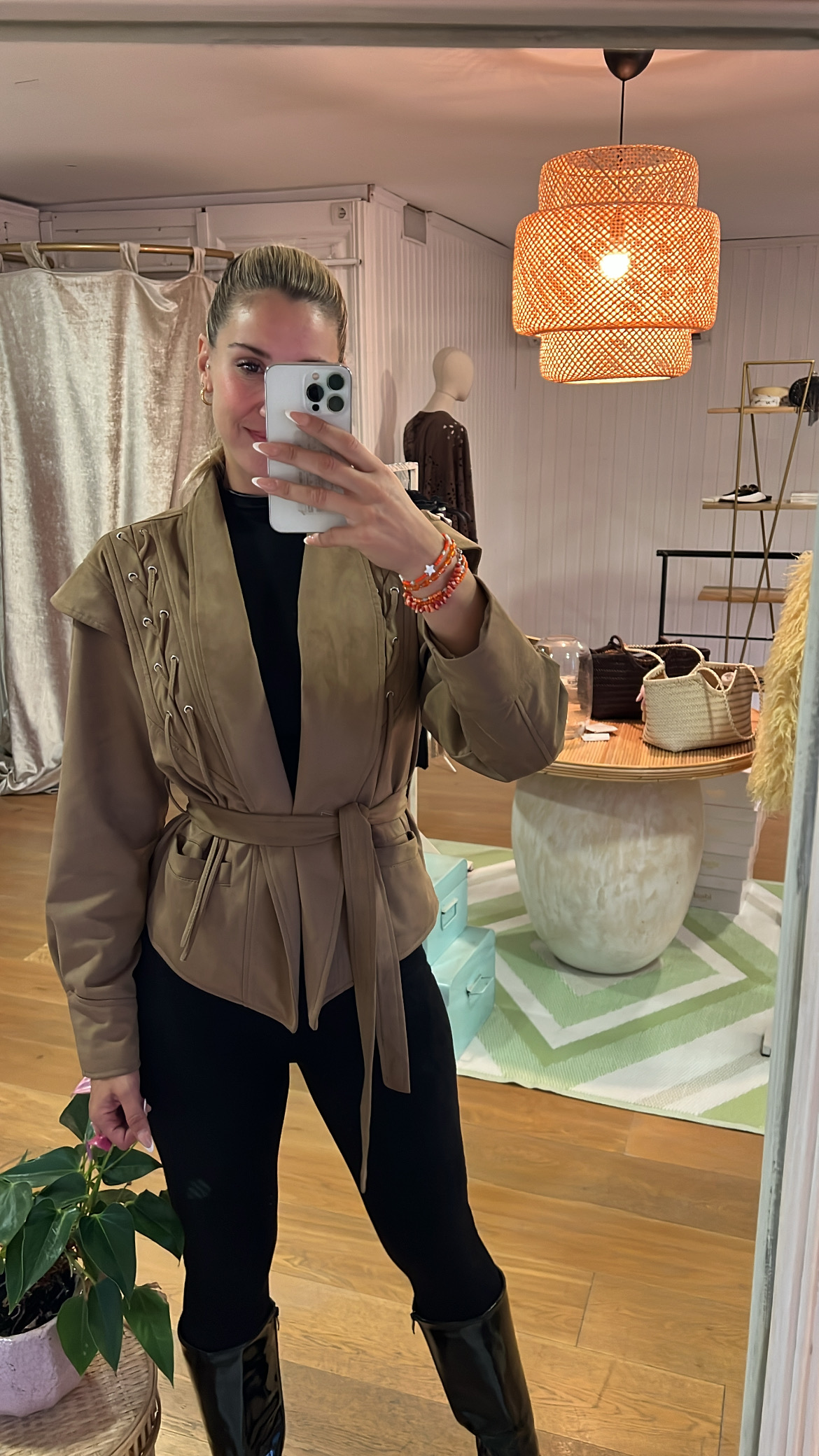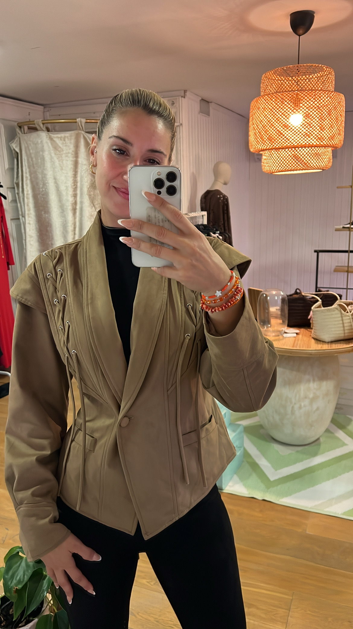 Chaqueta estilo blazer en tono camel con diseño estructurado que realza la silueta. Detalles de cordones decorativos en la parte frontal que le aportan un toque moderno y diferente. Incluye cinturón a juego para marcar la cintura y crear un look más femenino.