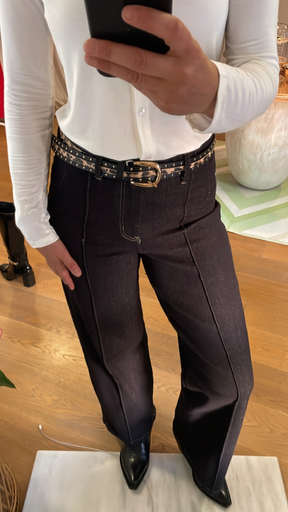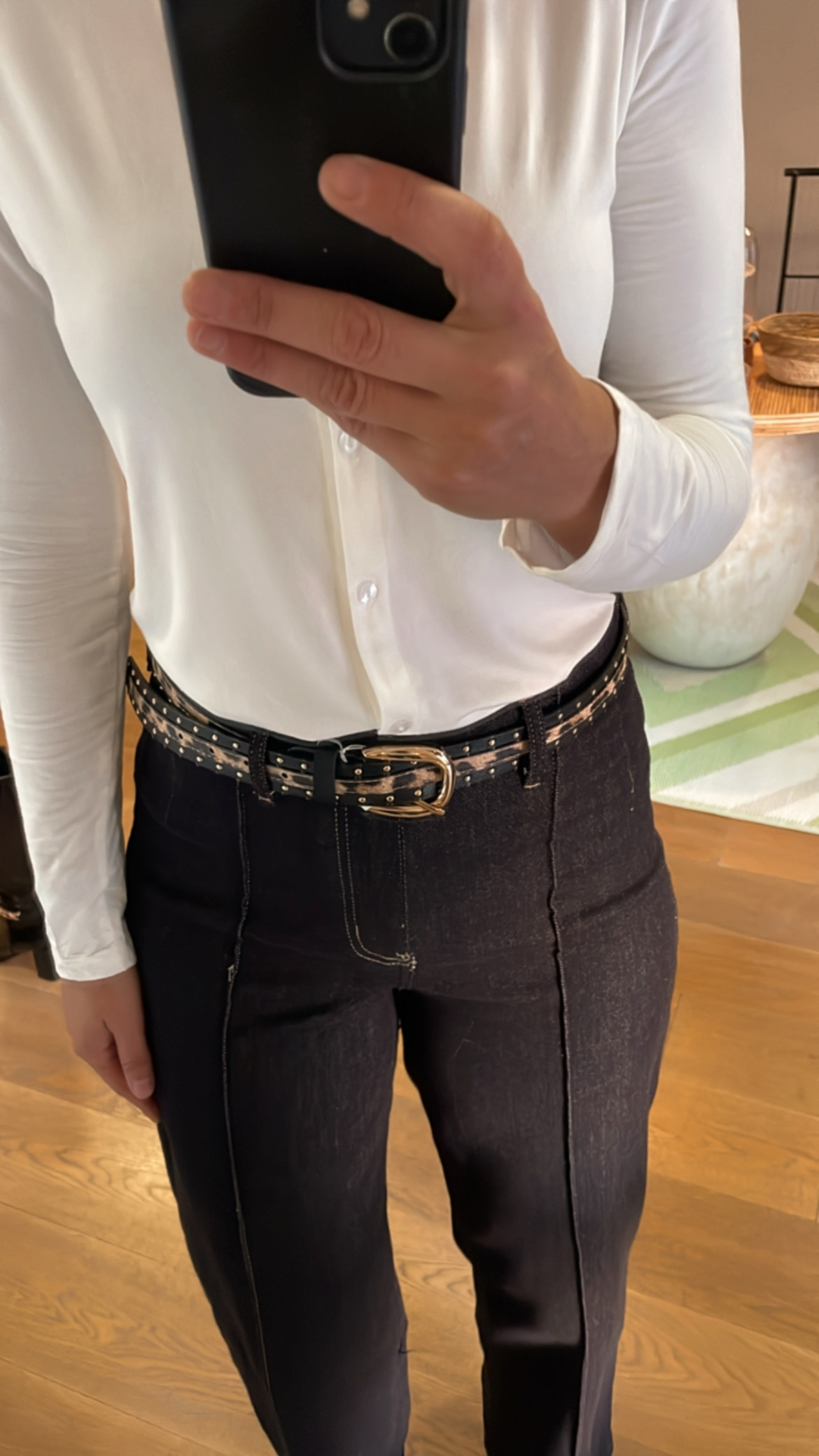 Un accesorio con carácter propio. Este cinturón en color negro destaca por su diseño con detalle de animal print, que aporta un aire moderno y atrevido. Las tachas metálicas en tono dorado realzan su estilo, creando un contraste elegante y lleno de personalidad.