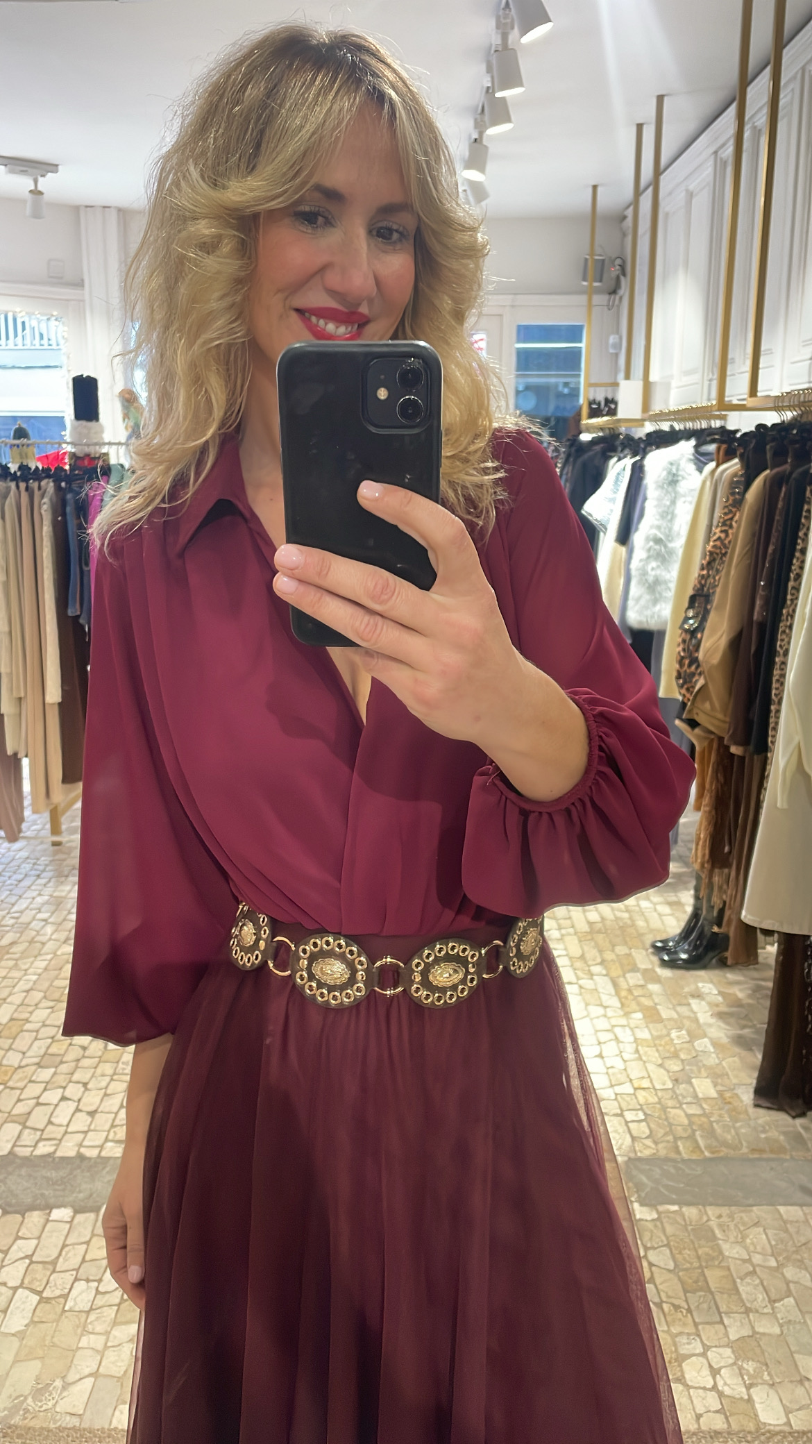 Camisa body en color burdeos, confeccionada en elegante crepé de seda de tacto suave y caída fluida. Presenta un favorecedor corte en pico, que estiliza la silueta y aporta un aire sofisticado.