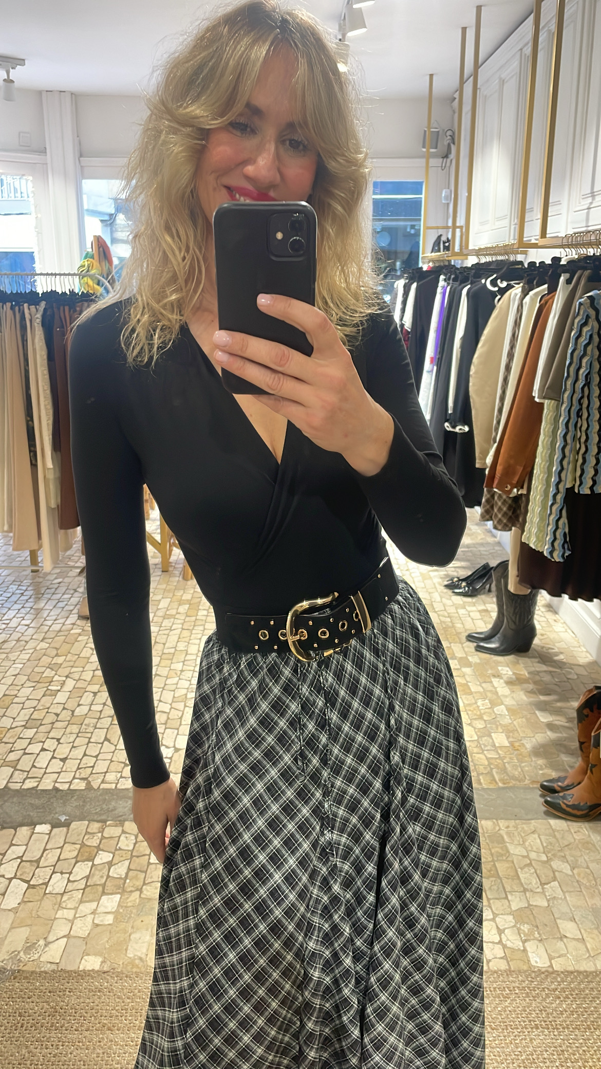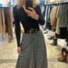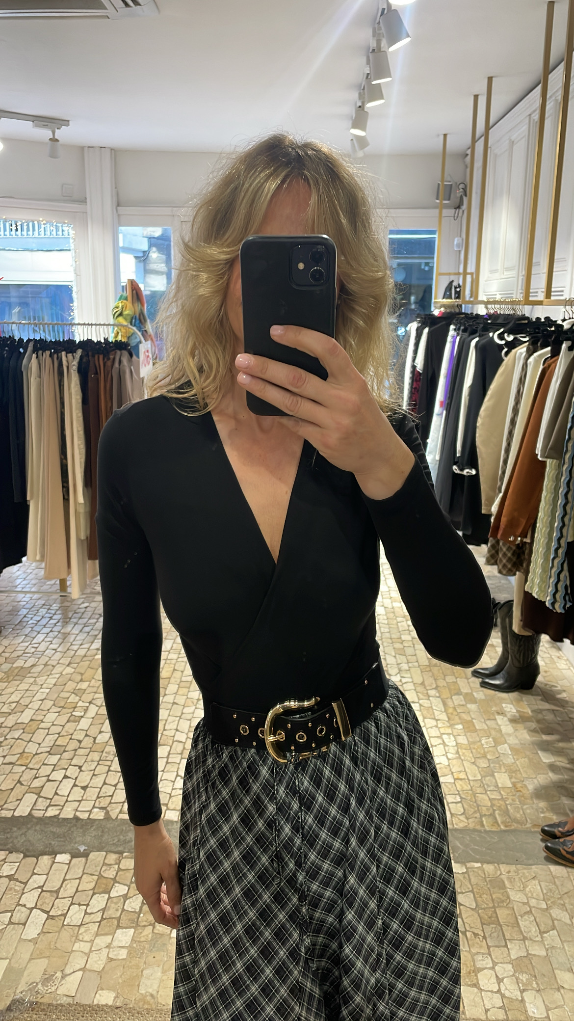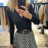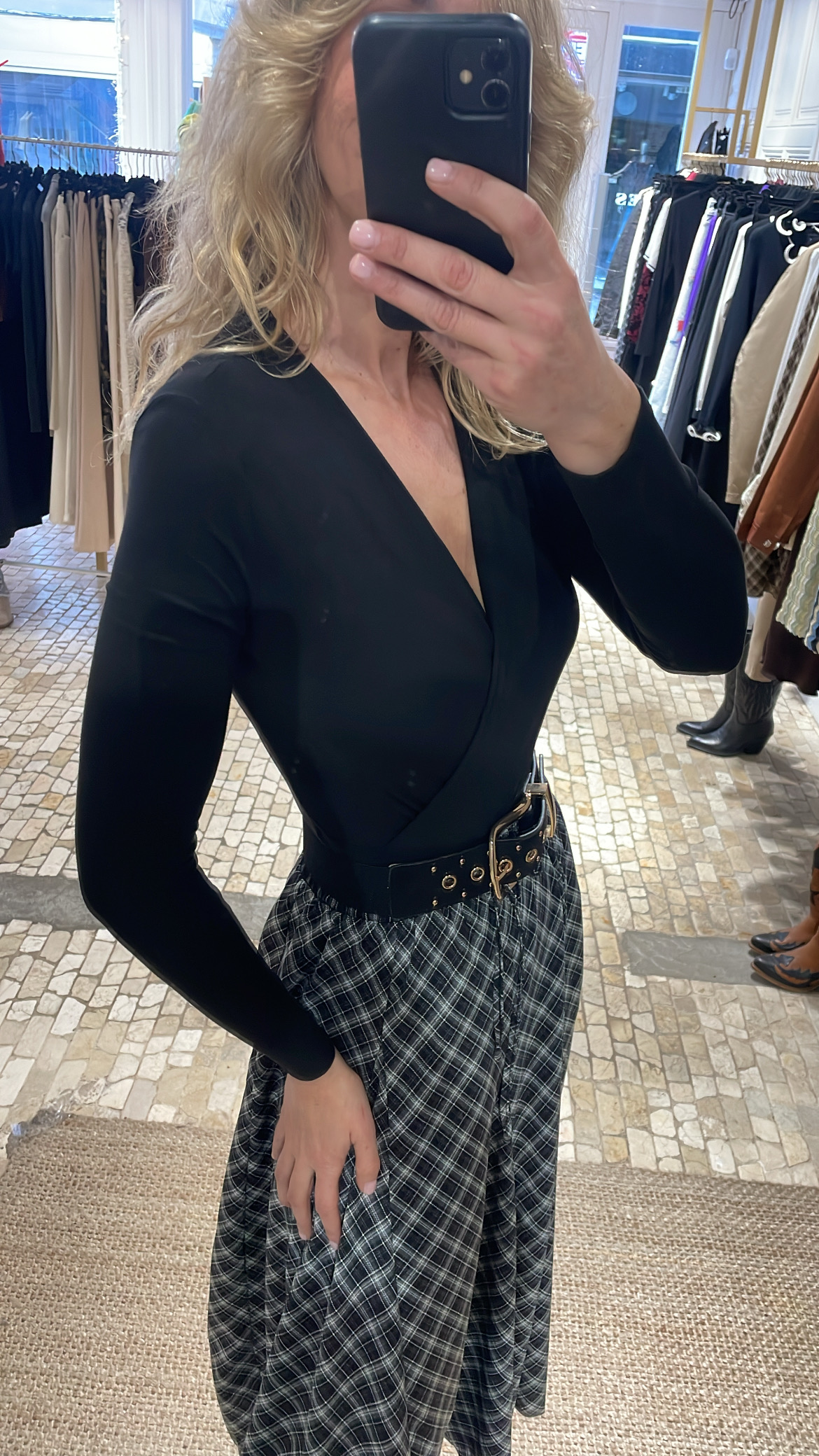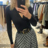 Body negro confeccionado en tejido de punto elástico, que se adapta cómodamente al cuerpo realzando la silueta. Presenta escote en pico cruzado, favorecedor y femenino, ideal para estilizar el torso. Disponible en tallas S, M y L. Una prenda básica y versátil, perfecta para combinar con faldas, pantalones o blazers tanto en looks de día como de noche.