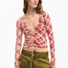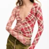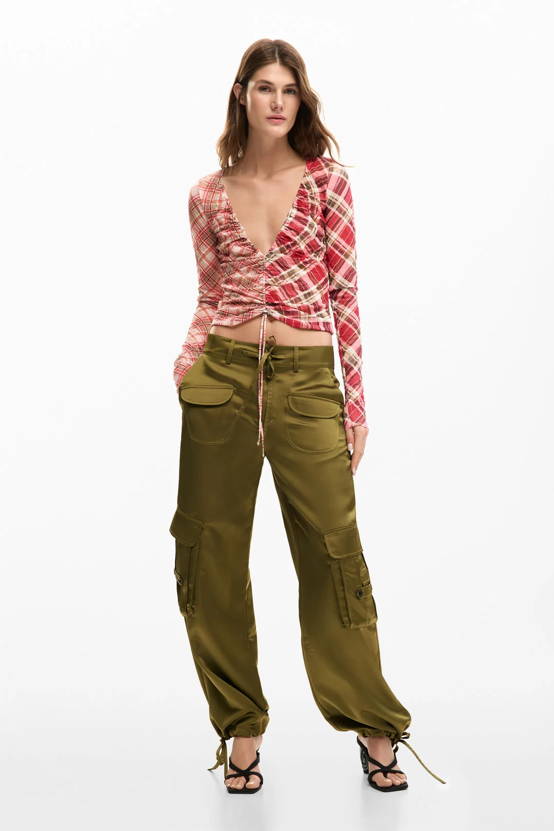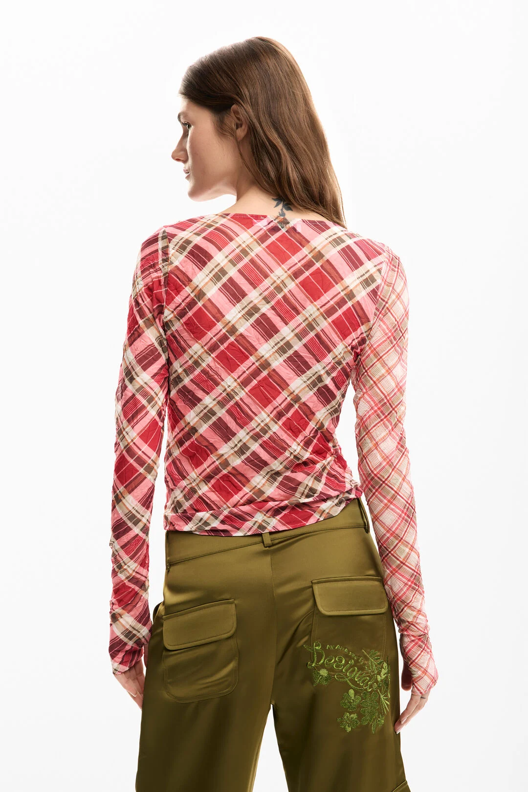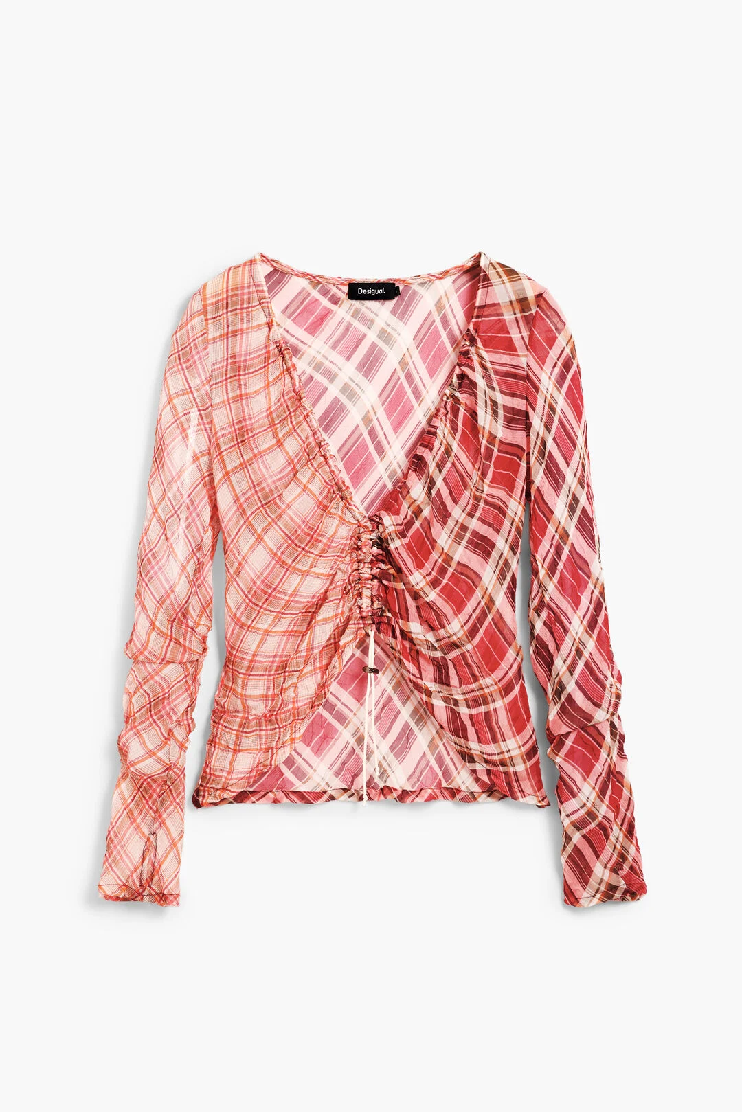 Camiseta de cuadros con fruncido en la parte delantera que regula el largo y estampado de cuadros en distintos tonos