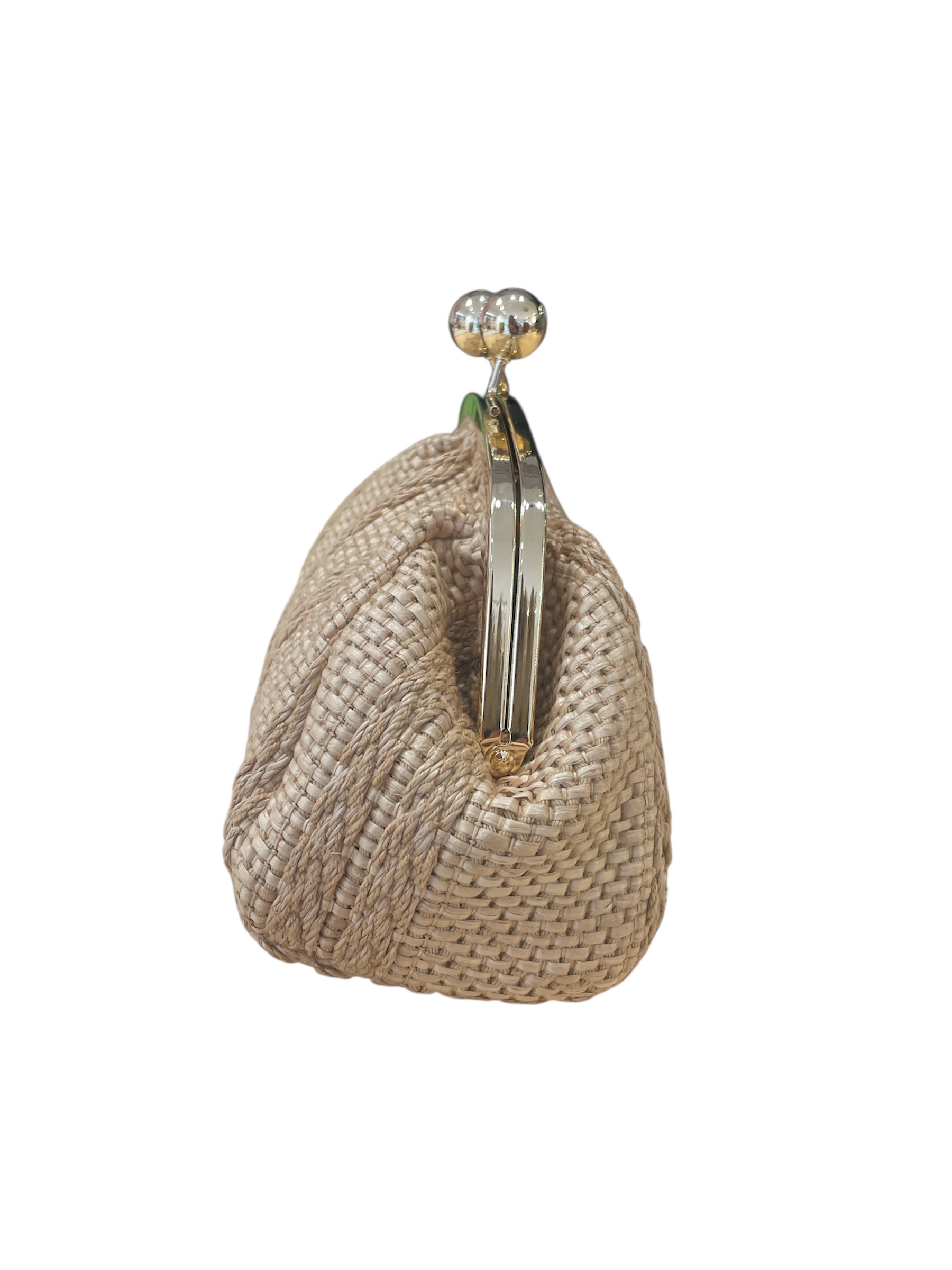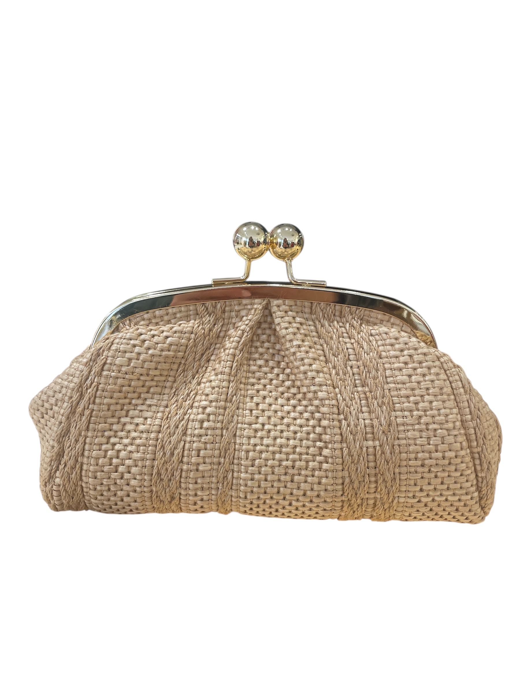 Elegante y con un aire natural y atemporal, esta cartera de rafia en color natural es el complemento ideal para cualquier ocasión. Su diseño original resalta la belleza de los materiales orgánicos, aportando frescura y ligereza al conjunto.