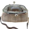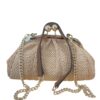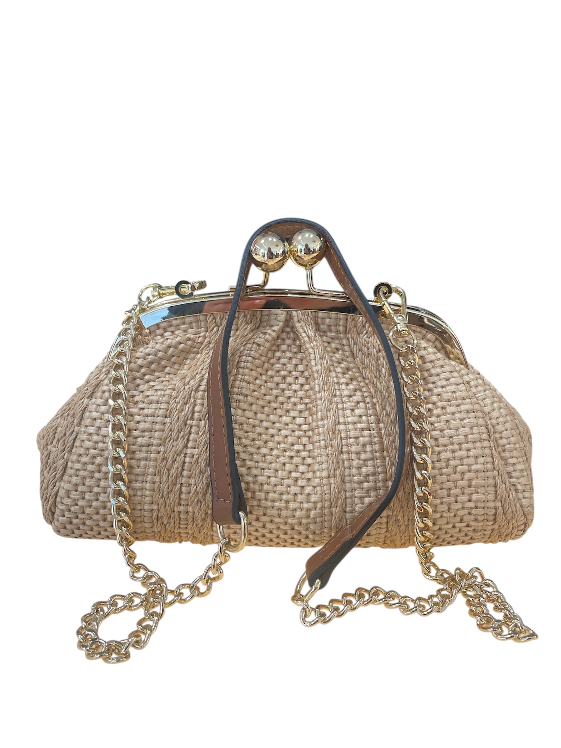 Cuenta con un cierre metálico en tono dorado que añade un toque sofisticado, mientras que la cadena para el hombro, combinada con un delicado detalle en piel, garantiza comodidad sin renunciar al estilo. Versátil y luminosa, es una pieza perfecta para completar looks tanto de día como de noche con un encanto natural.