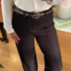 Un accesorio con carácter propio. Este cinturón en color negro destaca por su diseño con detalle de animal print, que aporta un aire moderno y atrevido. Las tachas metálicas en tono dorado realzan su estilo, creando un contraste elegante y lleno de personalidad.