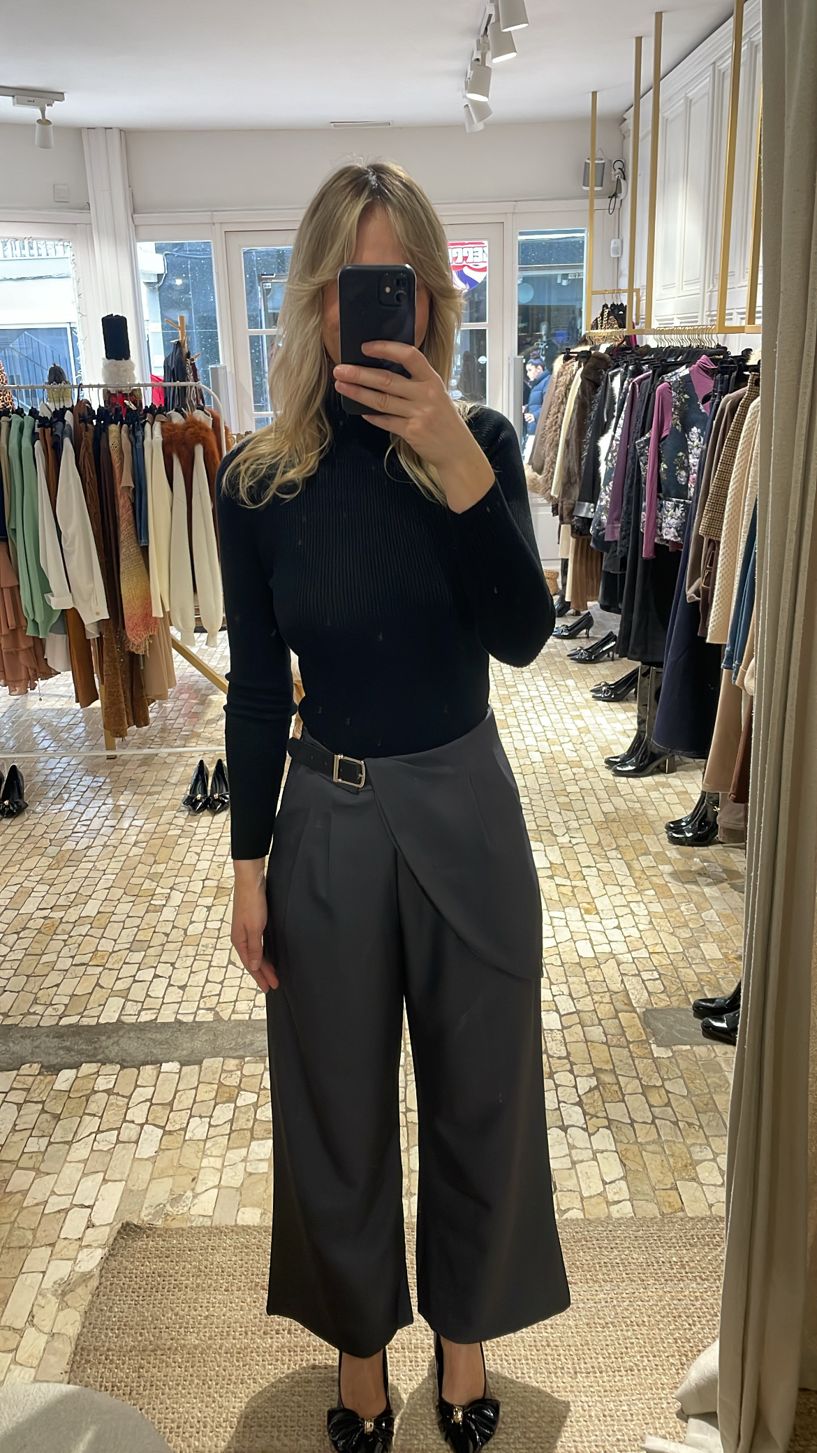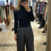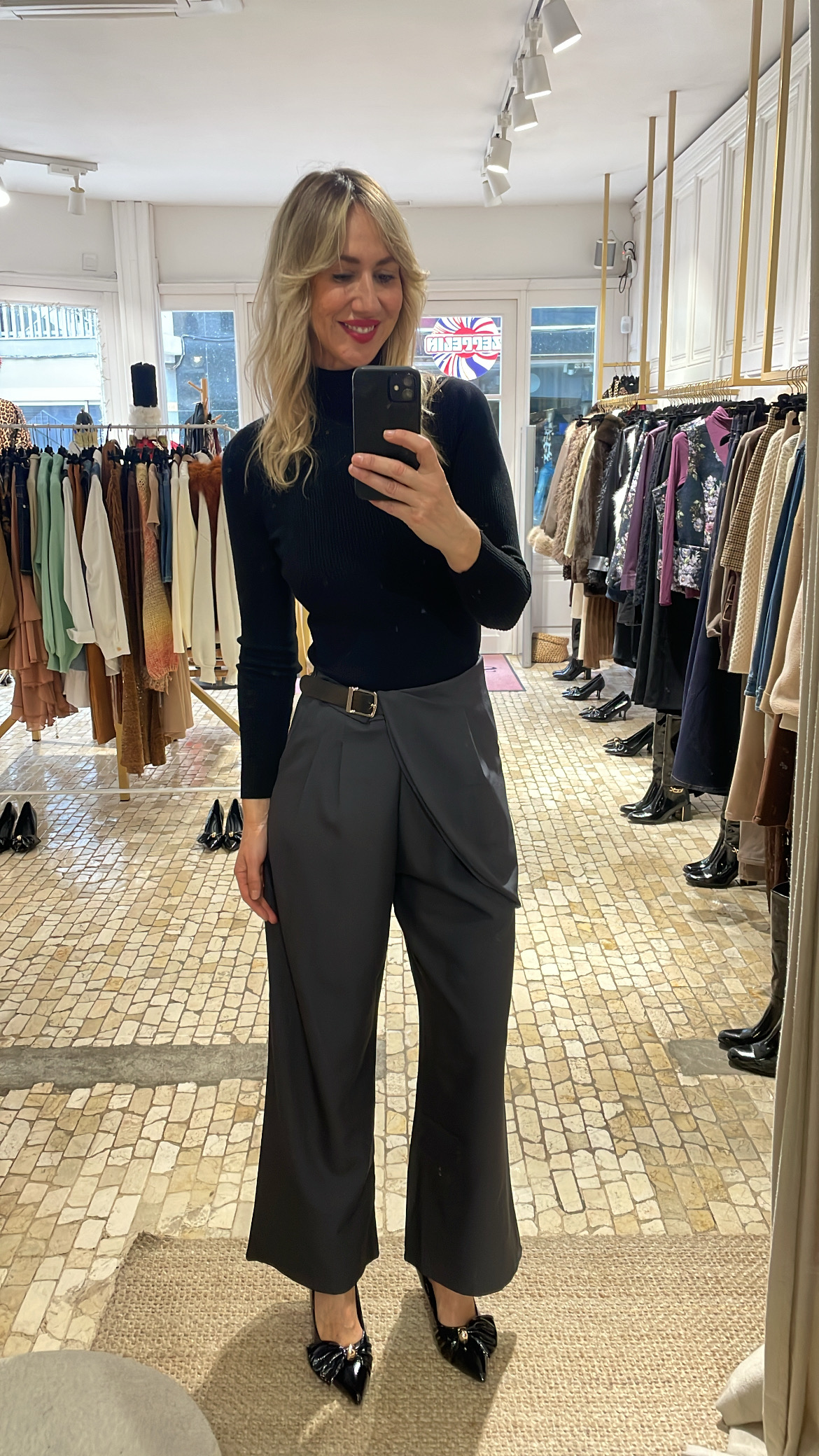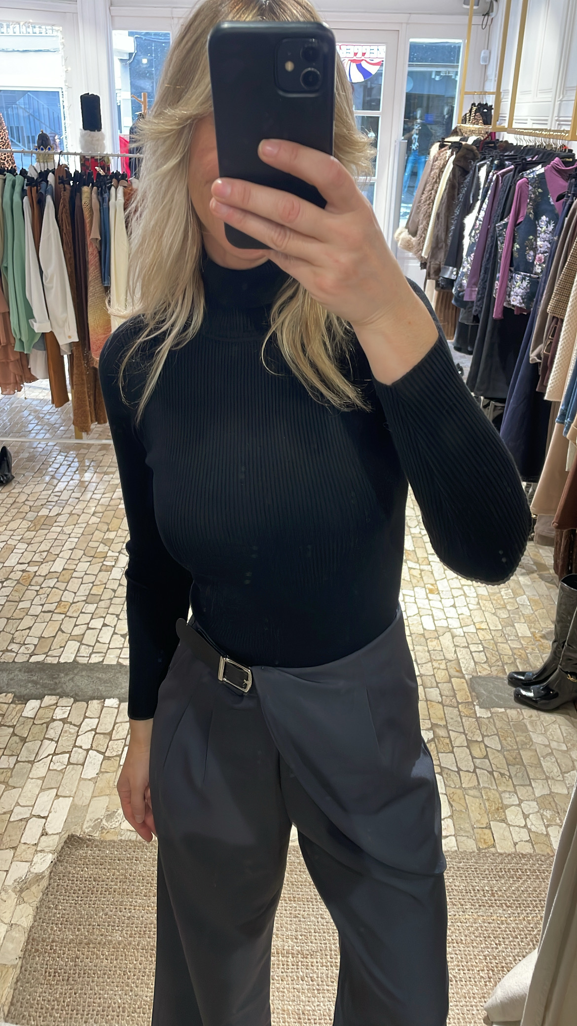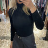 Jersey negro de canalé fino y estrecho, confeccionado en tejido elástico que se adapta cómodamente al cuerpo. De tacto suave y ajuste ceñido, es una prenda versátil y atemporal, ideal para crear looks elegantes o casuales con un acabado limpio y sofisticado.