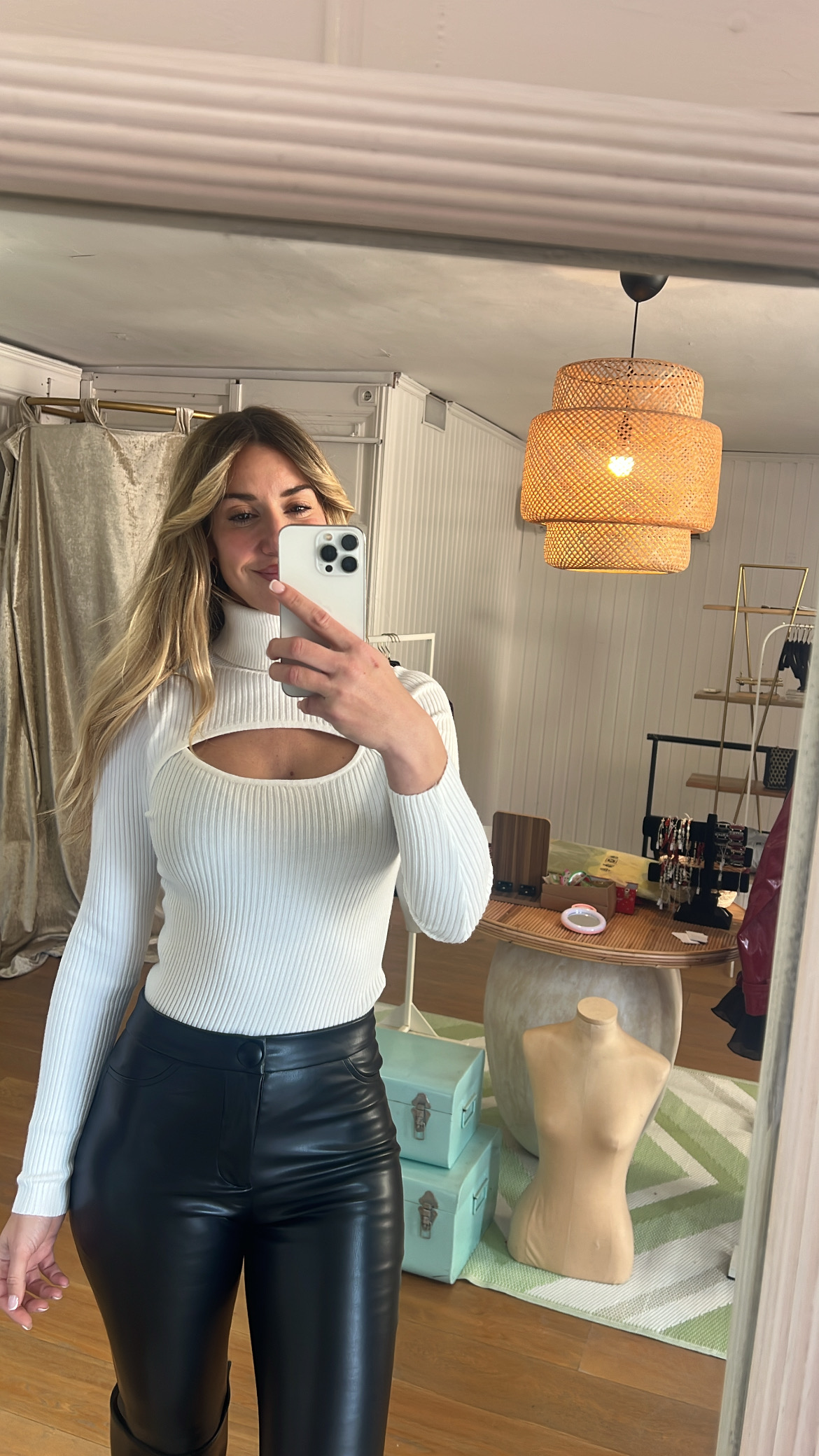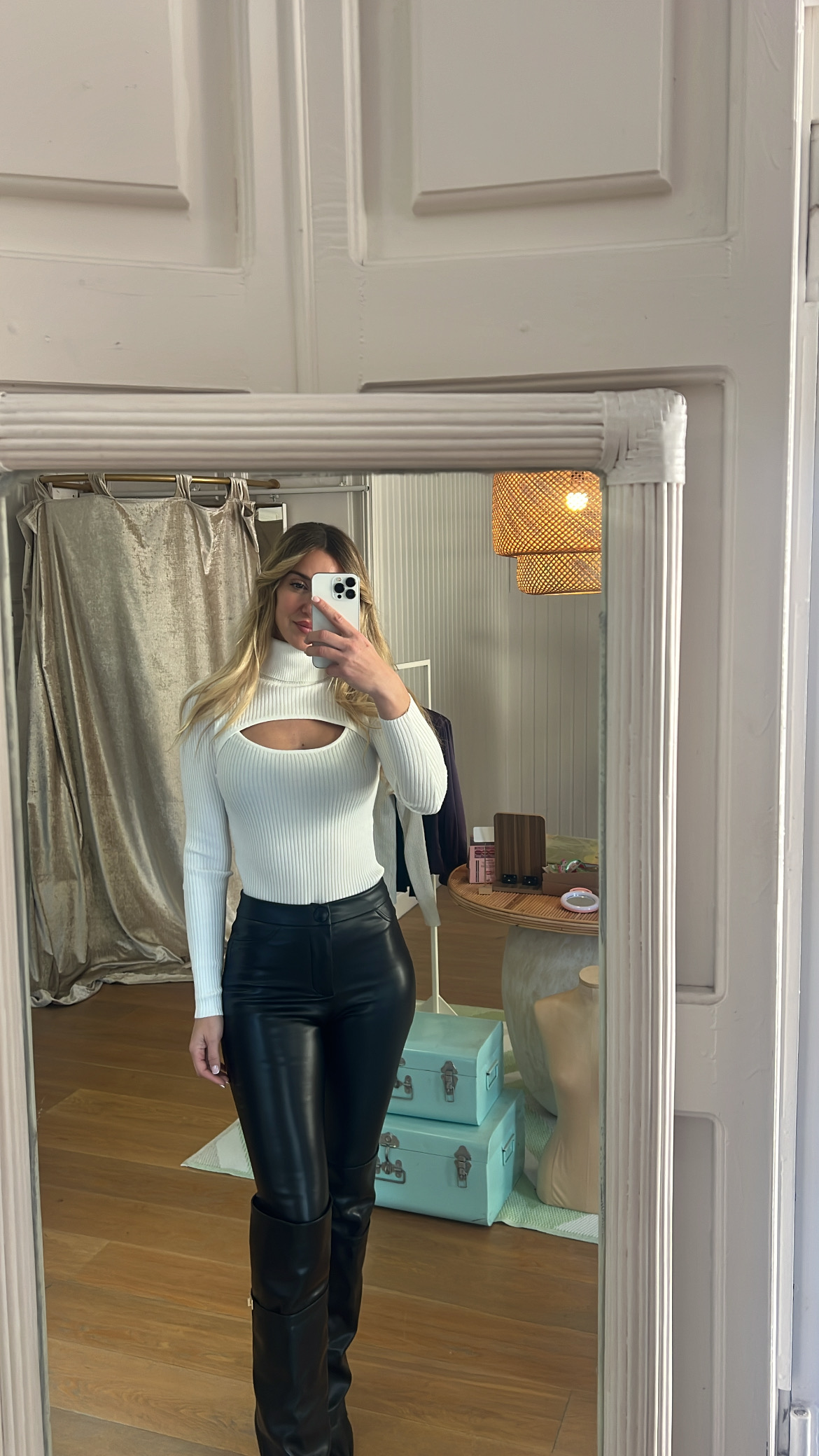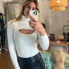 Suéter canalé blanco  con cut-out frontal y cuello alto.