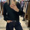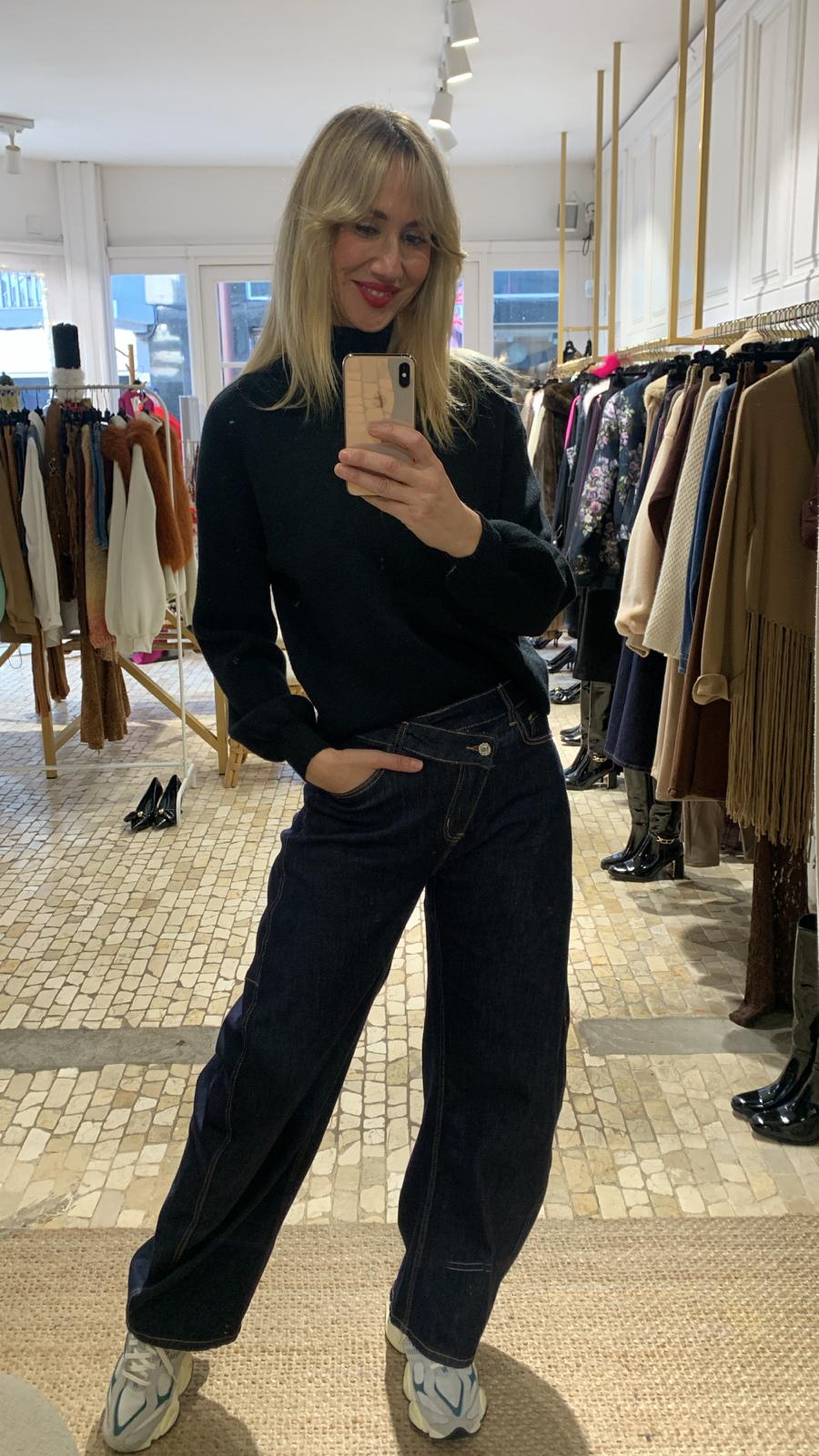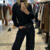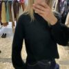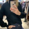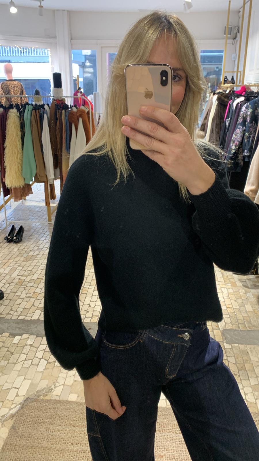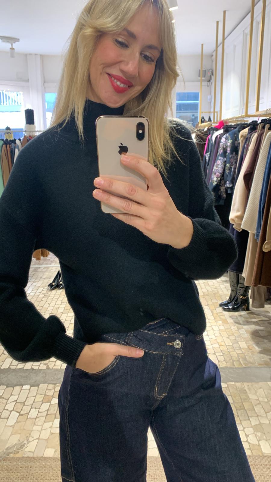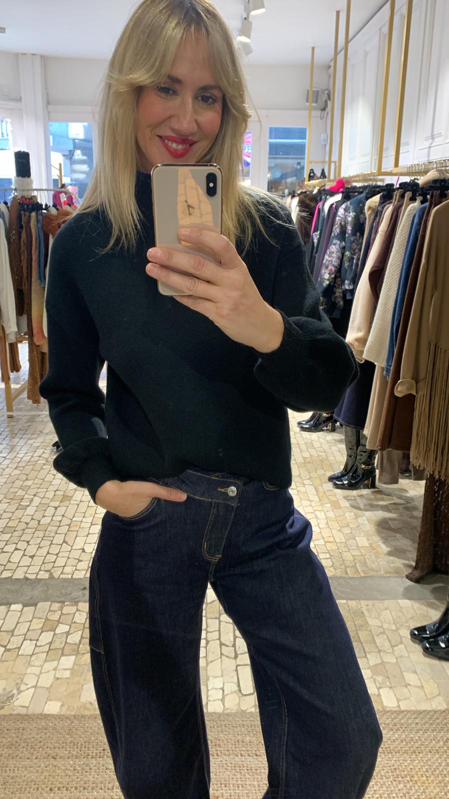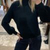 Jersey negro de punto con elástico muy suave al tacto, cómodo y agradable de llevar. Presenta cuello botella que estiliza y aporta calidez, y mangas abullonadas que le dan un aire moderno y femenino, rematadas con puño ajustado. Su tejido elástico se adapta perfectamente a la silueta, ofreciendo una caída favorecedora y libertad de movimiento.