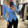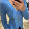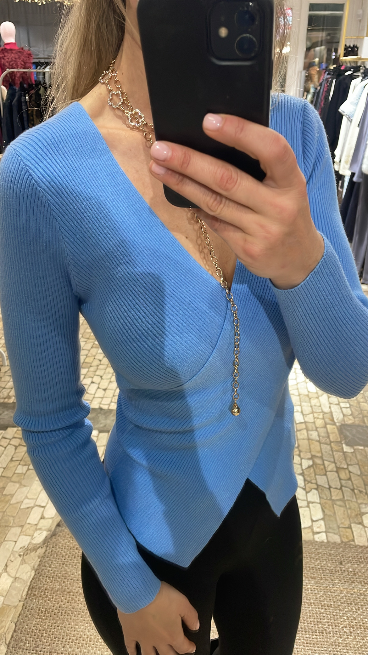 Diseño delantero en forma cruzada que realza el pecho y define la cintura de manera favorecedora. Confeccionado en tejido de punto elástico, cómodo y suave al tacto. Se adapta perfectamente a la silueta.