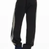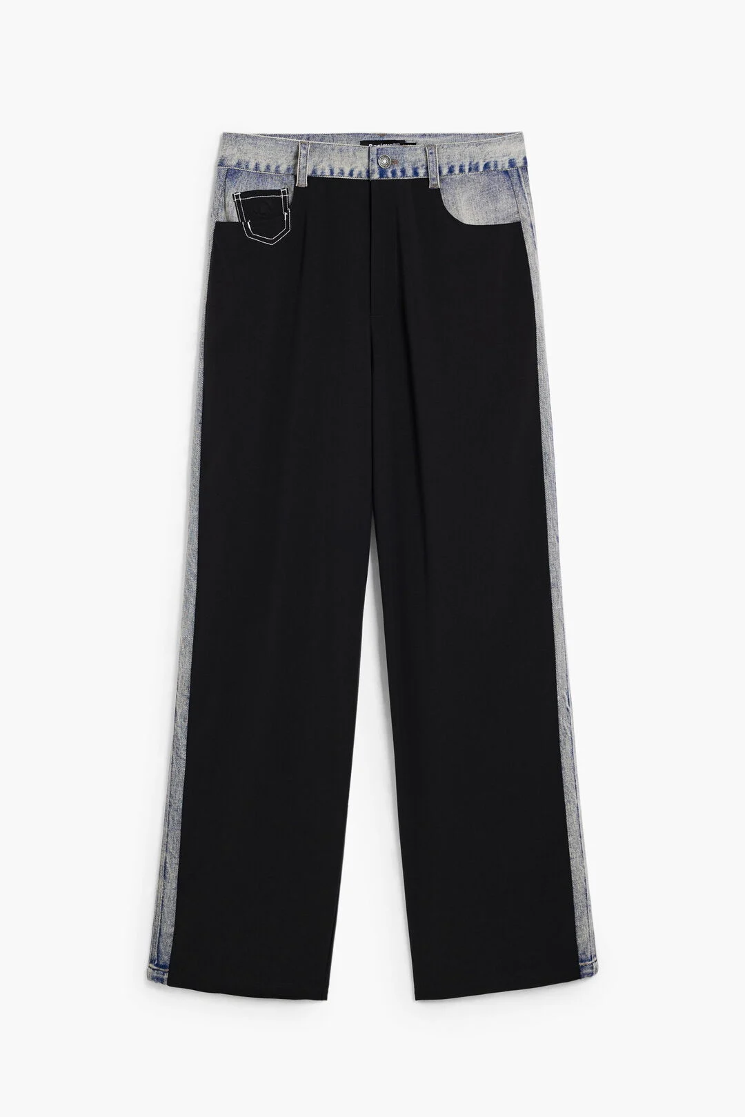 Pantalón confeccionado en tejidos combinados, cintura y paneles laterales en denim y piernas en tejido liso, de corte recto.
