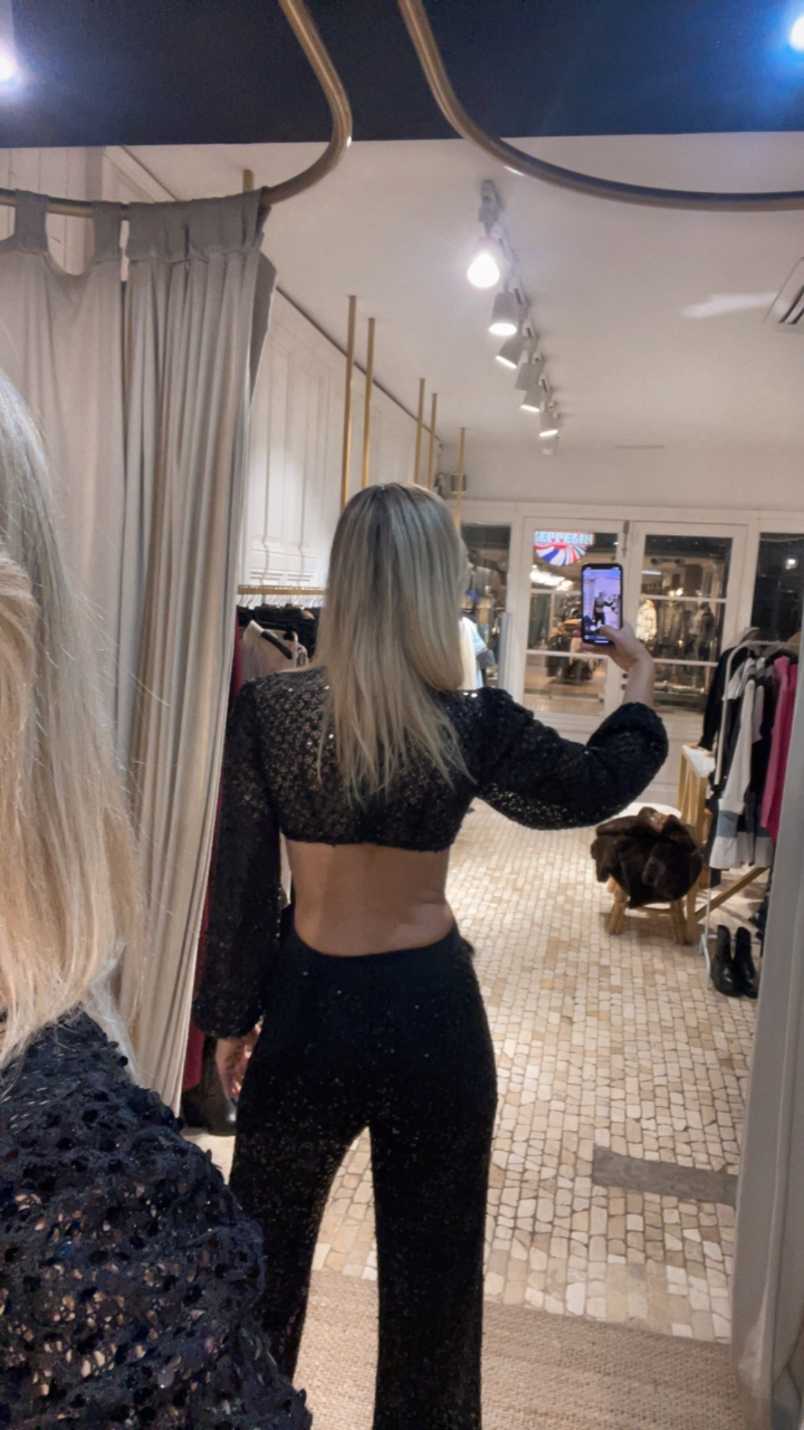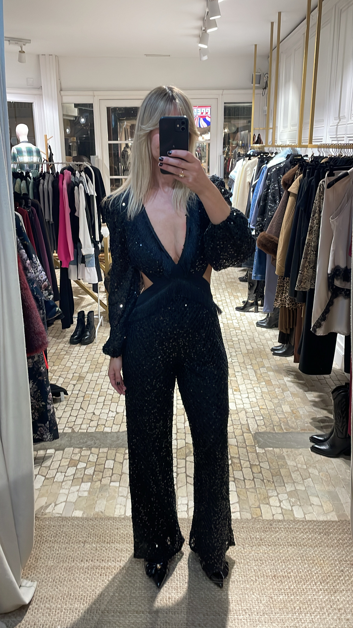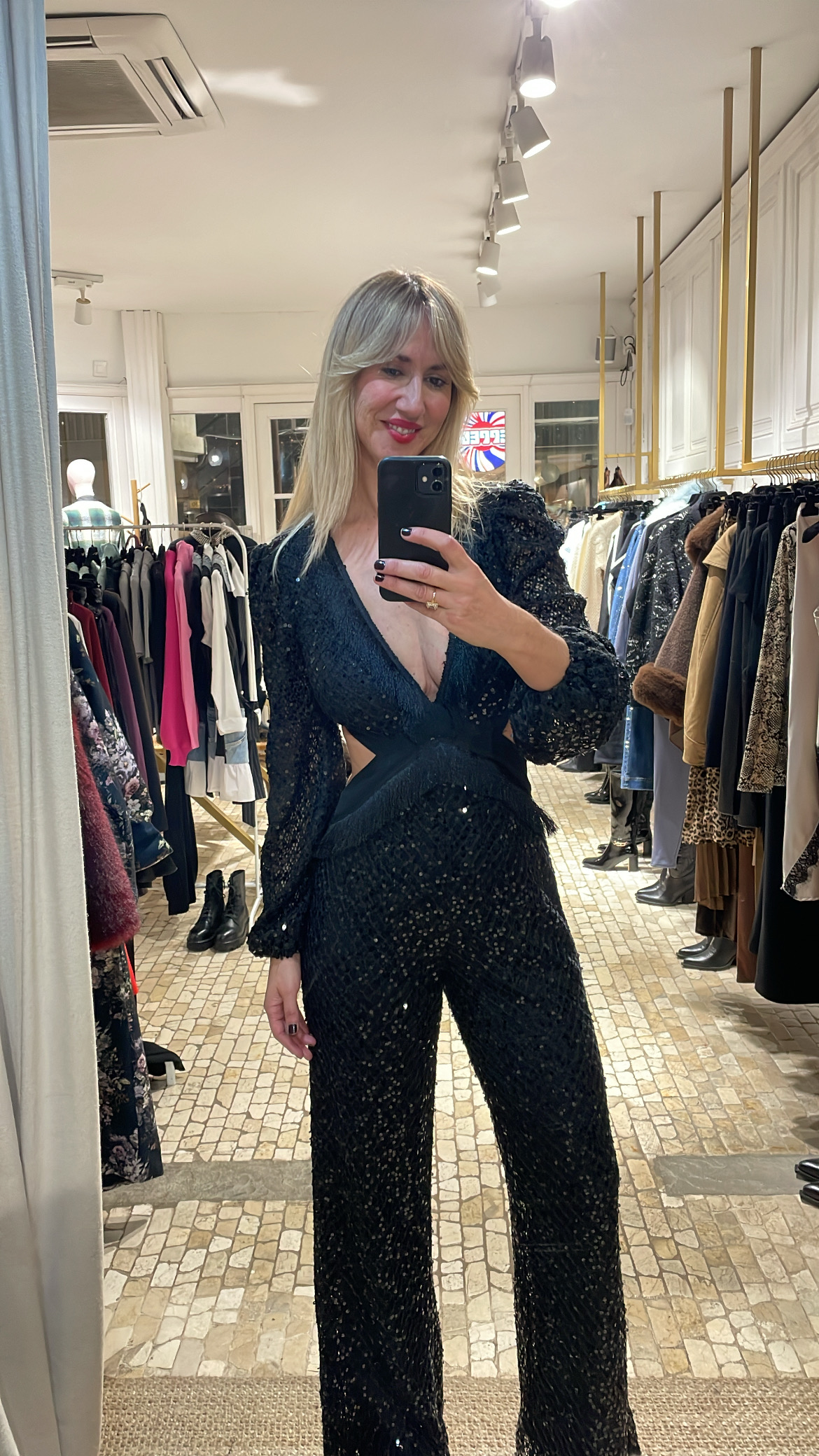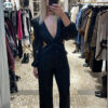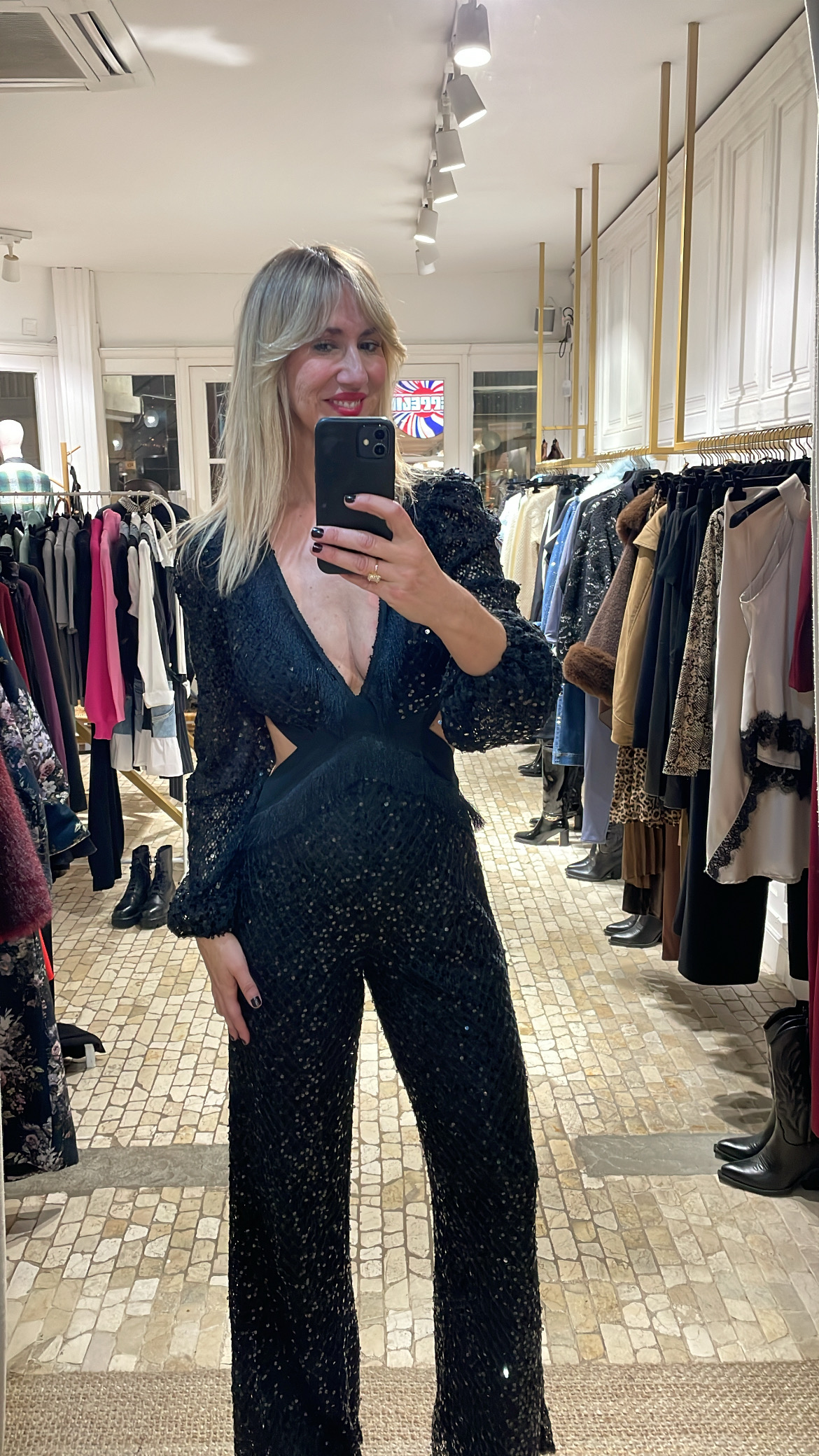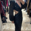 Mono de tejido blonda con lentejuelas en color negro, diseñado con un favorecedor escote en pico que incorpora un delicado detalle de flecos. Presenta sensuales aberturas cut out tanto en el escote como en la espalda, aportando un toque moderno y sofisticado. El ajuste es entallado y se completa con una cremallera trasera oculta que facilita la puesta. Una prenda elegante y llamativa, ideal para ocasiones especiales.