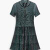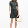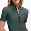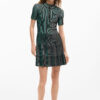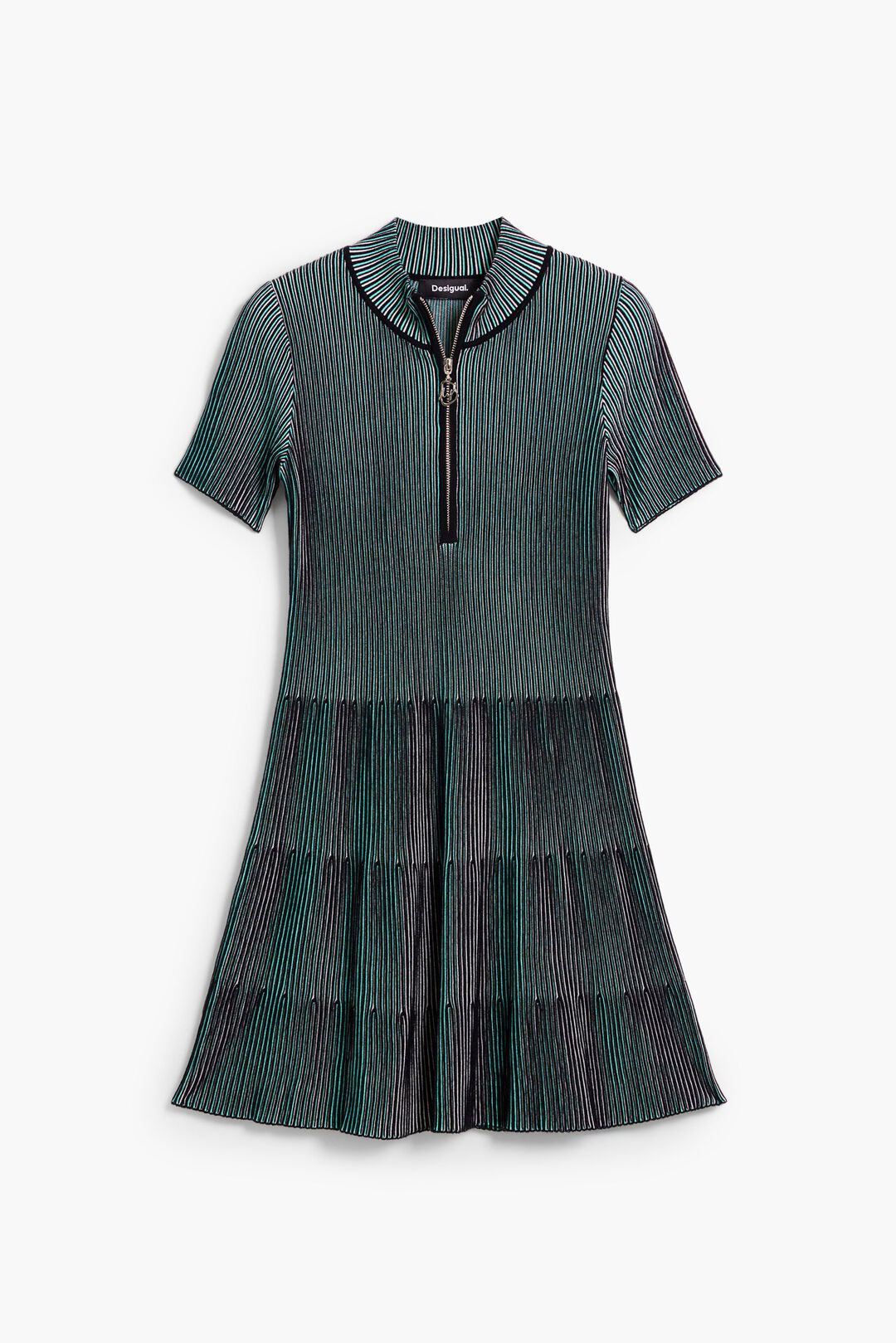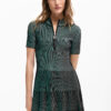 Vestido corto confeccionado en tejido con textura, con manga corta y detalle de cremallera en el cuello.