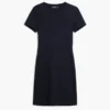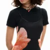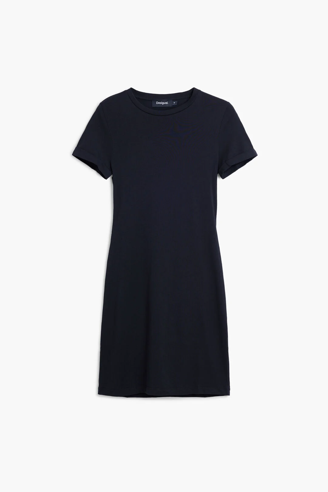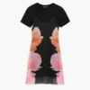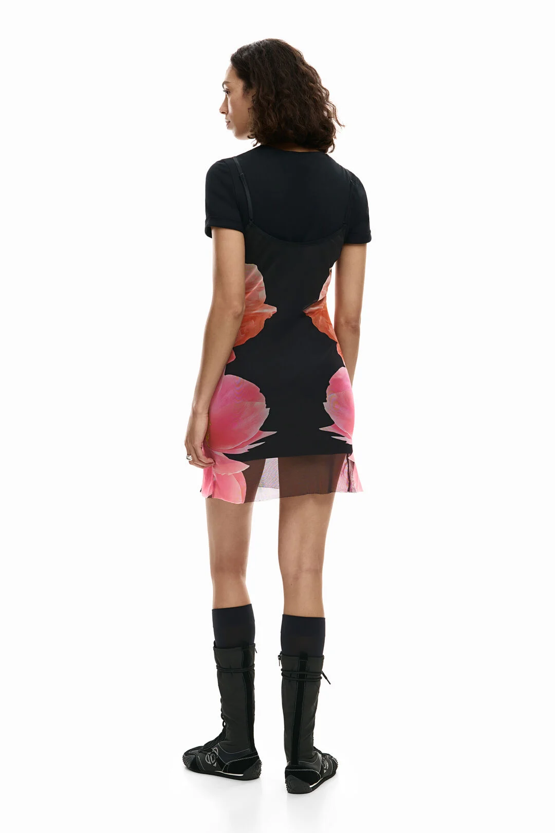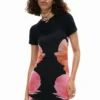 Vestido de punto con manga corta y cuello redondo. Diseño con estampado floral en la parte frontal y fondo negro. Corte recto y tejido elástico.